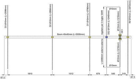 Progetto di antenna Yagi per la nuova banda a 40,700 MHz. Si tratta di una 4 elementi con boom da ~5m e radiatore costituito da un classico dipolo ripiegato sul piano verticale.